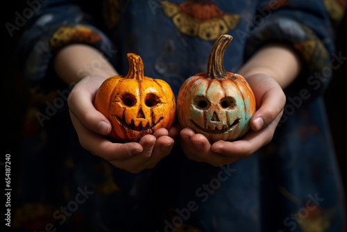 Happy child holding glowing jack-o-lantern pumpkin for Halloween