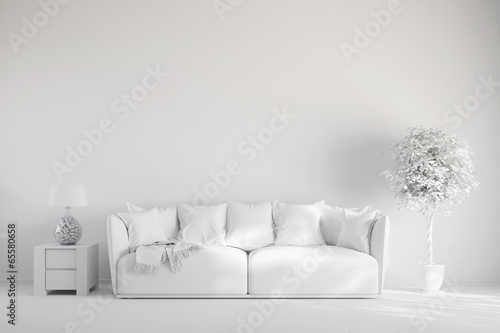 Modern minimalist living room with white sofa and indoor plants
