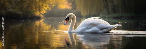 Elegant swan on a tranquil lake at sunset, reflecting calmness and beauty