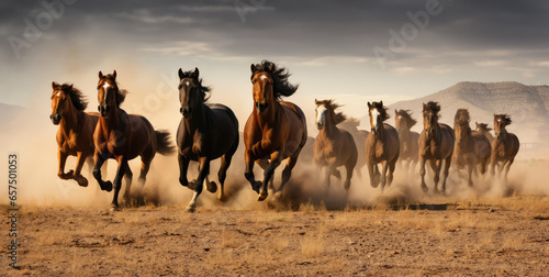 Majestic wild horses galloping across a dusty terrain