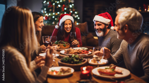 Joyful friends and family sharing a tasty dinner in a cozy living room