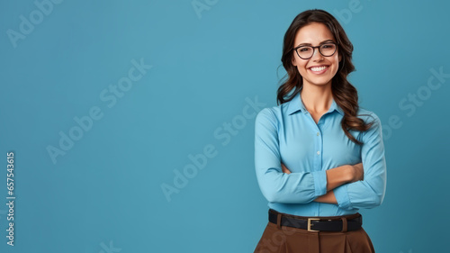 Confident businesswoman smiling with arms crossed on blue background