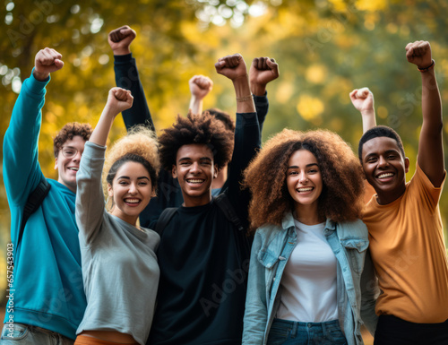 Happy group of young multiracial college students raising hands