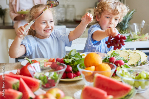 Happy siblings near table with fruits and vegetables at home