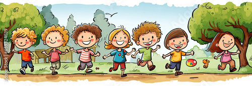Kindergarten kids in park comic panorama