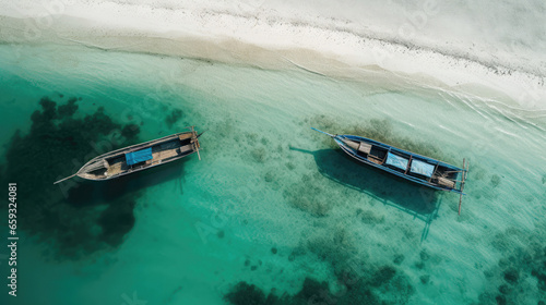 Two boats on turquoise beach, calm day