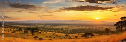 Golden hour sunlight bathing an African savanna with scattered acacia trees