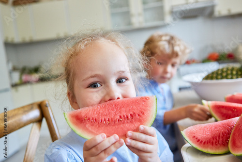Girl examining watermelon slices in kitchen
