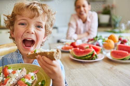 Boy screaming while holding bruschetta at home