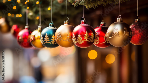 Christmas tree balls hanging from ceiling as christmas decoration background