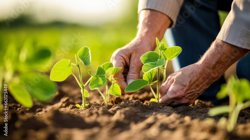 Hands of old soybean farmer examing seedlings in field