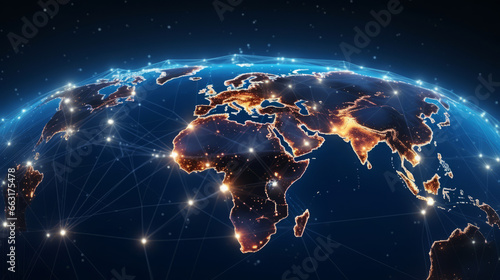 Digital map of Africa illuminated with glowing connections representing data networks