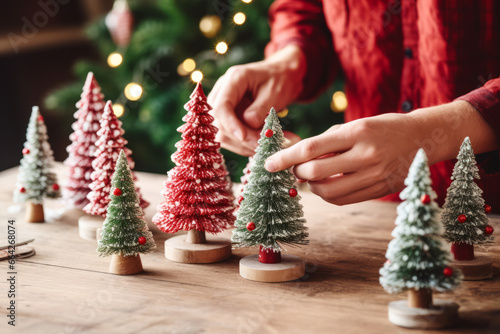 Hands arranging festive mini Christmas trees on a wooden table with glowing lights in the background