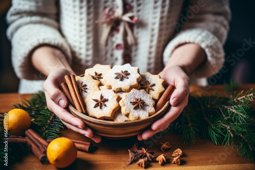 Hands holding bowl of Christmas cookies with spices on rustic table