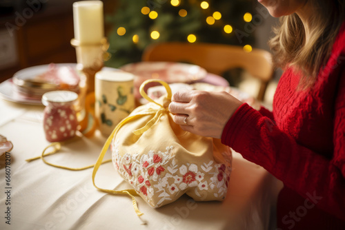 Woman in red tying festive gift pouch on holiday table with warm decor