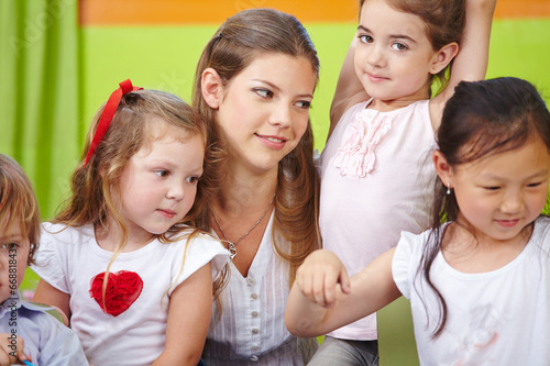 Lächelnde Erzieherin mit Kindern im Kindergarten