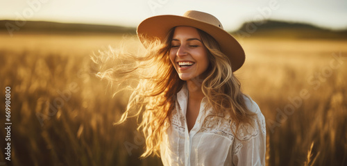 Joyful woman with curly hair laughing in wheat field on a sunny day