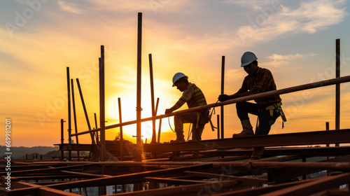 Silhouette of construction workers on building into sunset