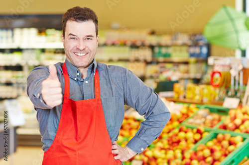 Ältere Verkäuferin hält Daumen hoch im Supermarkt