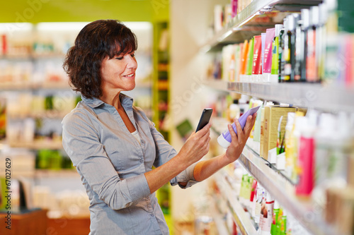 Frau mit Smartphone scannt Produkt im Supermarkt