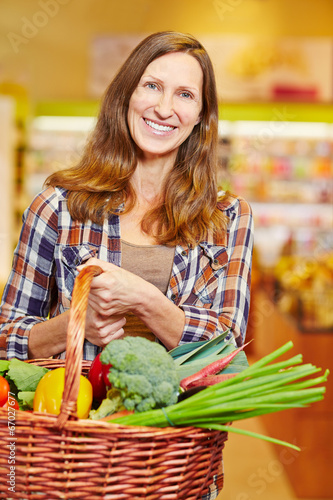 Frau mit Einkaufszettel kauft Gemüse im Bioladen