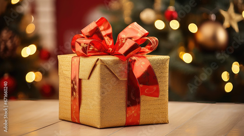 Golden gift box, red bow, Christmas light backdrop
