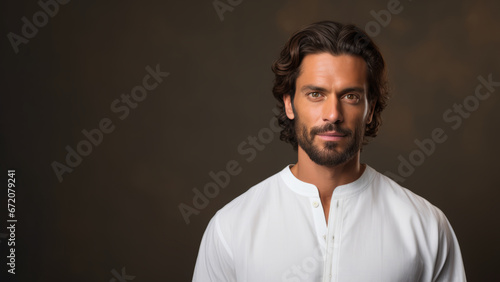 Middle Eastern man in 30s, medium black hair, studio
