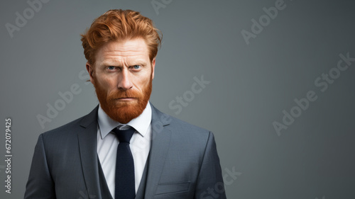 Determined man in his 30s with red hair wearing a suit, looking confident and focused in a professional portrait setting