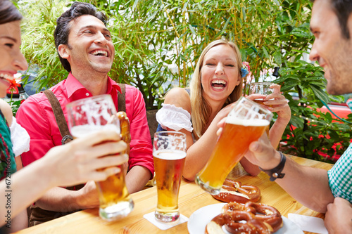 Freunde feiern Oktoberfest mit Bier und Brezel