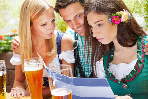 Freunde beim Oktoberfest feiern in Dirndl und Lederhose