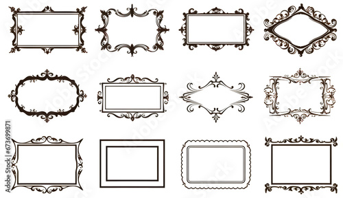 Vintage calligraphic frames with ornate gold detailing on a dark background