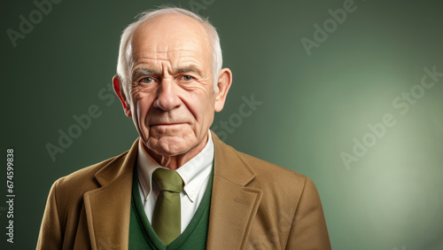 Portrait of a tenacious senior man in his late 60s with a receding hairline, wearing a striped shirt and tie in front of a green background