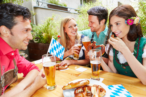 Freunde reden und flirten im Biergarten in Bayern