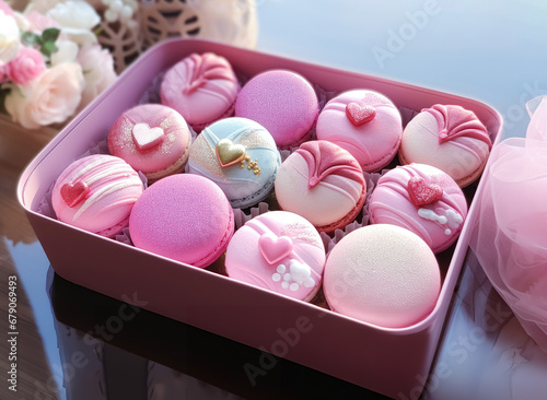 Delicate pink and rose macaroons in pink box for Valentine's