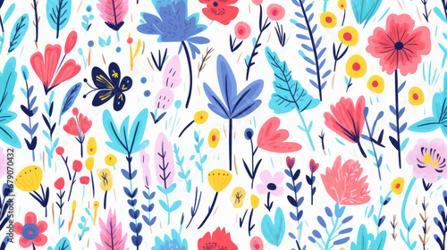 Colorful seamless abstract floral pattern with hand-drawn playful elements
