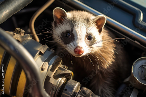 Curious ferret peeking from a car engine bay, highlighted by warm sunlight