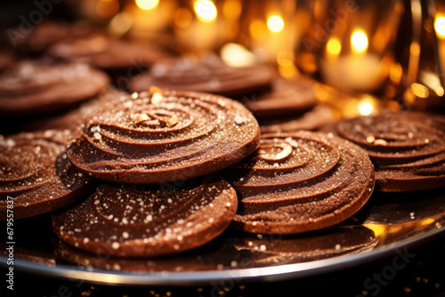Close-up of spiral chocolate cookies with a golden shimmer against a bokeh background