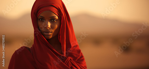 Serene African woman in her 40s with long braided hair in contemplative pose