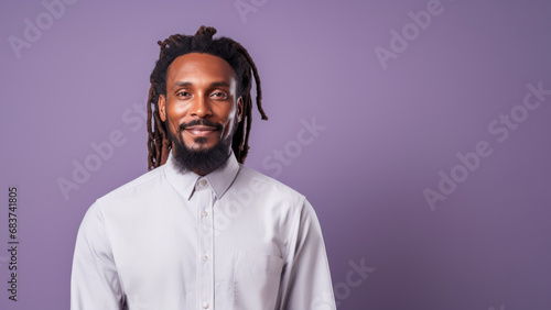 Stylish man with dreadlocks posing in a white shirt on a violet background