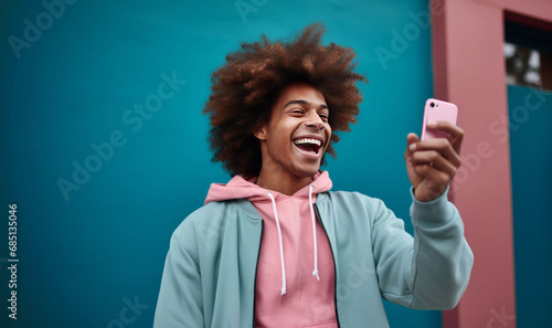 Joyful young man with an afro taking a selfie against a vivid blue and pink background