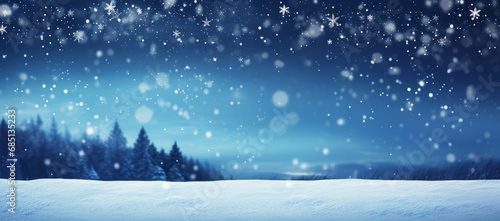 Winter background with snow falling over snowy forest landscape at night
