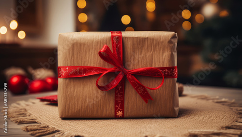 Hands showing small wrapped gift with red ribbon for Christmas or Valentine's