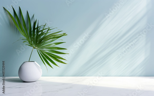 Elegant white vase with a single palm leaf on a marble counter against a shadow-patterned blue wall