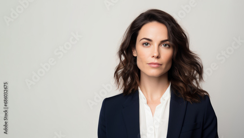 Focused woman in her 30s with brunette hair in a dark blue jacket