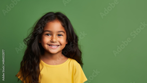 Joyful child with sleek black hair and vibrant orange shirt smiling against a bright teal background