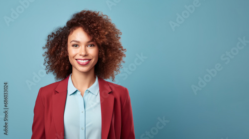 Confident woman in her 40s with stylish curly hair posing in a studio