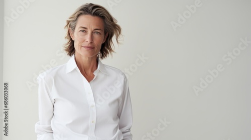 Confident businesswoman in white shirt against neutral background