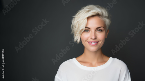 Radiant Caucasian woman, 20s, with pixie platinum hair