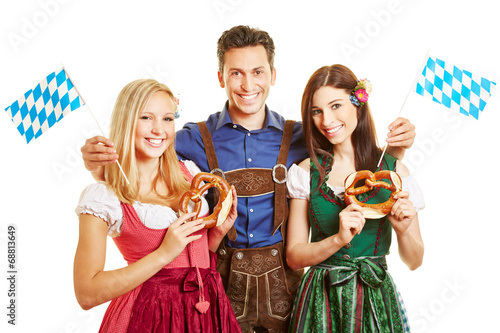 Freunde feiern Oktoberfest mit Bier und Brezel