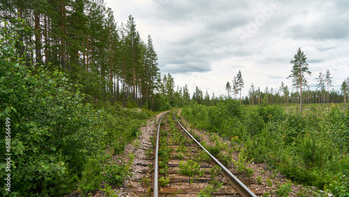Schienen für Bahn im Gleis neben Garten im Frühling